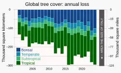 Le taux de perte du couvert forestier mondial a approximativement doublé depuis 2001, pour atteindre une perte annuelle approchant une superficie de la taille de l'Italie[102],[103].