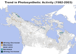 Les forêts boréales subissent un impact disproportionné du changement climatique, avec un taux de réchauffement plus élevé que la moyenne mondiale[52]. Cette situation conduit à des conditions plus sèches dans la taïga, engendrant ainsi divers problèmes[53]. En effet, la productivité, la santé et la régénération de la forêt boréale sont directement affectées par ces changements climatiques[53]. De plus, la migration rapide des arbres vers des latitudes et des altitudes plus élevées (vers le nord) en raison du changement climatique peut s'accompagner d'un risque d'incapacité de certaines espèces à migrer suffisamment rapidement pour suivre leur habitat climatique[54],[55]. Par ailleurs, les arbres situés à la limite sud de leur aire de répartition peuvent également subir une baisse de croissance[56]. Enfin, la sècheresse accélérée entraîne une transition des conifères aux trembles dans les zones les plus vulnérables aux incendies et à la sécheresse[53].