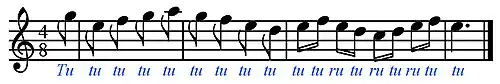 Cette deuxième manière de faire produit, dans une suite de croches, un silence plus long après les croches no 2 et no 4, alors que la première manière le produit après les croches no 1 et no 3. Dans tous les cas, le silence principal précède Tu, consonne occlusive, qui stoppe l'air, et non pas Ru, consonne roulée, ni Du, consonne voisée, qui laissent toutes deux passer de l'air.