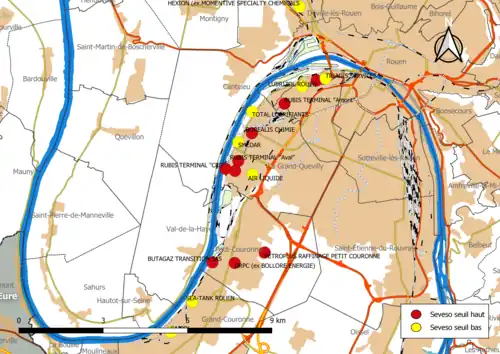 - Le préfet, qui élabore le Plan particulier d'intervention (PPI) pour faire face à un sinistre dont les conséquences dépassent les limites de l’établissement[31]. Le préfet est alors directeur des opérations de secours. La finalité de ce plan de secours est de protéger la population voisine des effets du sinistre. Ce plan, annexé au dispositif ORSEC départemental, définit le rôle de chacun des acteurs du risque majeur en cas d’accident grave. Le PPI est obligatoire pour tous les établissements classés Seveso « seuil haut ». Compte tenu de la densité du tissu industriel, et afin de prendre en compte les effets de réaction en chaîne qui pourraient en résulter, des PPI dits « de zone » ont été arrêtés pour la zone de Rouen, qui concerne vingt établissements dont l'entreprise Lubrizol[32], mais aussi pour les zones du Havre, d'Elbeuf, de Port-Jérôme et de Caudebec-en-Caux.