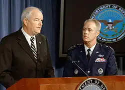 - ↑ US DoD, "DoD News Briefing with Secretary Gates from the Pentagon", Military Times, "Moseley and Wynne forced out", Shanker, "2 Leaders Ousted From Air Force in Atomic Errors".