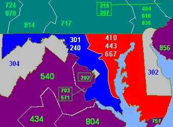 La carte ci-contre indique en rouge le territoire couvert par les indicatifs 410, 443 et 667.