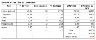 L'indice Gallagher est de 31,16 pour les élections 2012 de l'État du Queensland - le parti gagnant obtenant 87 % des sièges avec moins de 50 % des votes