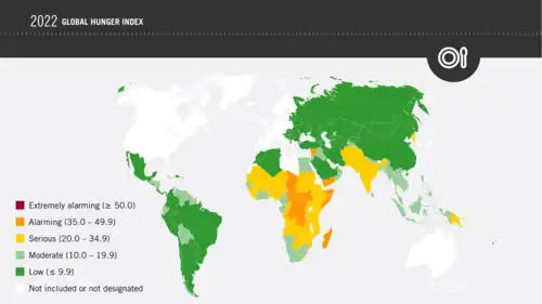 L'indice de la faim dans le monde permet de classer les pays sur une échelle de 0 à 100, 0 étant la meilleure note (pas faim) et 100 la pire, mais en pratique ces valeurs extrêmes ne sont jamais atteintes. Plus la note est élevée, et plus la situation alimentaire du pays est mauvaise. Les notes inférieures à 4,9 indiquent un problème de la faim « bas », entre 5 et 9,9 une situation « modérée», entre 10 et 19,9 une situation « grave », entre 20 et 29,9 une situation « alarmante » et des valeurs supérieures à 30 sont « extrêmement alarmantes »[2].