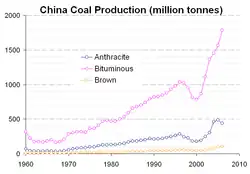 La Chine est devenue en 2008, un importateur net de charbon[15], alors qu'en 2007, elle exportait encore 2 millions de tonnes, en 2006, 25,1 millions de tonnes et en 2001, 90 millions de tonnes.