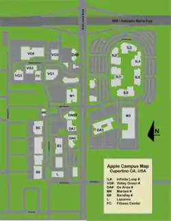 Chacun des bâtiments possède un numéro à un seul chiffre correspondant à son emplacement dans le long de cette rue, et l'adresse officielle d'Apple est ainsi 1 Infinite Loop. Les numéros de rues s'incrémentent dans le sens horaire et les employés se réfèrent souvent aux bâtiments par les appellations « IL1 » à « IL6 ». La rue est reliée à Mariani Avenue, adresse antérieure du siège de la société ; les anciens documents imprimés portaient par exemple l'adresse 20525 Mariani Avenue.