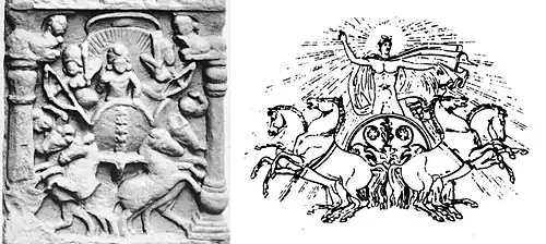 Un célèbre relief de Bodhgaya montrant le dieu indien Surya sur un quadrige est également souvent mentionné comme un exemple possible de l'influence hellénistique sur l'art indien[49],. La représentation de Surya est en effet très similaire à certains reliefs grecs d'Apollon sur son char à cheval quadrige. D'autres auteurs soulignent l'influence de la monnaie gréco-bactrienne dans laquelle apparaissent parfois des scènes de quadrige similaires, comme sur la monnaie de Platon de Bactriane[50].