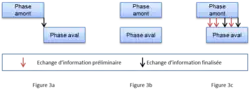 Une approche pour accélérer l’ensemble du processus de développement de produit serait de découpler les tâches à réaliser, sans échange d’information entre les phases, et de les faire en parallèle (figure 3b). Pourtant, ce type d’organisation nécessiterait de profondément modifier les étapes et/ou l’architecture du produit. Une approche alternative serait de faire chevaucher les étapes entre elles en augmentant la fréquence des échanges d’information entre étape en amont et étape en aval[5] (figure 3c). Dans l’ingénierie concourante, les équipes s’organisent en parallèle pour faire avancer le projet. Une métaphore couramment utilisée pour décrire le CE est celle de l’équipe de rugby organisée en ligne pour faire progresser le ballon alors que l’organisation des activités en séquence s’apparenterait plus à une course de relais, le jalon étant transmis successivement entre coéquipiers[6]. Ici, le point essentiel est la façon dont les échanges d’information ont lieu. Afin que les activités puissent se réaliser de manière concourante, l’information est décomposée et fournie le plus rapidement possible aux processus en aval afin que ceux-ci puissent démarrer le plus tôt possible, quitte à devoir faire évoluer le processus aval lorsque des informations complémentaires sont fournies par l’activité en amont.