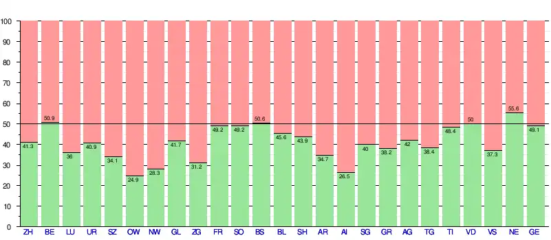 Soumise à la votation le , l'initiative est refusée par 17 5/2 cantons[NB 2] et 55,6 % des suffrages exprimés[10]. Le tableau ci-dessous détaille les résultats par cantons[11] :