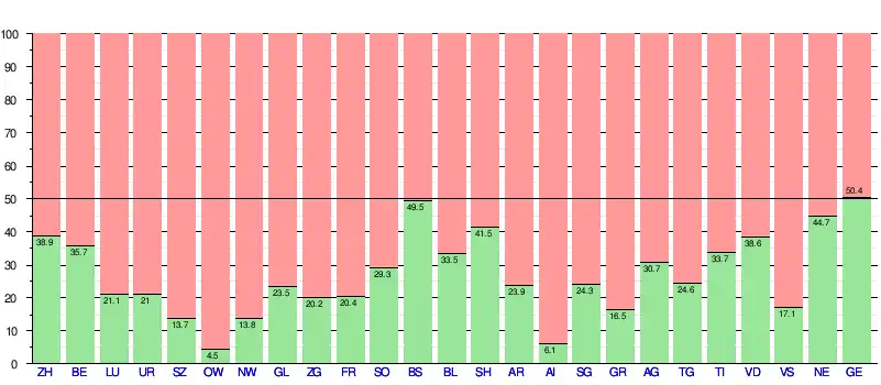 Soumise à la votation le , l'initiative est refusée par 18 6/2 cantons (soit tous à l'exception du canton de Genève) et 67,3 % des suffrages exprimés[6]. Le tableau ci-dessous détaille les résultats par cantons[7] :