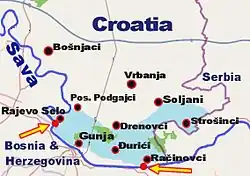 La Slavonie est la région la plus touchée par les inondations. La digue située dans la Save commence à se rompre près de Rajevo Selo et Račinovci, forçant ainsi l'évacuation de la population à Gunja, Rajevo selo et Račinovci. Le , près de 15 000 personnes dans la région croate est sont évacuées[26]. La digue de Slavonski Šamac atteint, elle, un point critique causé par l'énorme quantité d'eau en provenance de Bosnie. De nombreux officiels rapportent que si la digue cédait, le sud de la Slavonie et sa population de 300 000 personnes, seraient inondés[27]. Des inondations touchent également la région de Banovina, en particulier les villes de Hrvatska Kostajnica et Dvor, principalement causées par la Una, dans le niveau n'a pas monté depuis 1955[28].