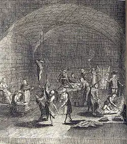 - La garrucha ou estrapade : la victime est hissée lentement à l'aide d'une poulie en haut d'un mât et suspendue ainsi par ses poings liés dans le dos puis on la laisse tomber violemment par saccades sans toucher le sol afin que ses articulations se disloquent. Si le poids du torturé est trop léger, on ajoute un poids pour alourdir l'ensemble[41].