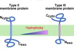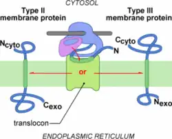 L'insertion cotraductionelle des protéines membranaires de type II et III utilise également le complexe de translocation. C'est le peptide signal qui est différent car il est responsable à la fois de l'adressage au translocon et de l'ancrage membranaire. Ce Peptide Signal ne possède pas de site de clivage comme dans les cas des protéines de type I. Il est généralement plus long (de 18 à 25 résidus essentiellement apolaires) puisqu'il doit être suffisamment long pour former une hélice transmembranaire[6]. De plus, le peptide signal des protéines membranaires de type II et III est positionné à l'intérieur de la séquence plutôt qu'à l'extrémité N-terminale. On parle également de Signal d'Ancrage pour désigner le Peptide Signal des protéines de type II et III.