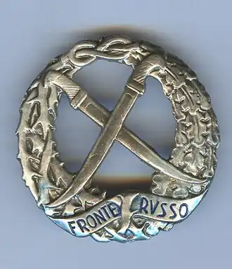 - ↑ Les insignes de souvenir sont portés sur la veste de l'uniforme ordinaire et de service (et dérivés), au nombre maximum de deux, et sont appliqués de la manière suivante : au-dessus de la poche droite, les insignes de parachutiste en guerre, de souvenir de la campagne de Russie, du 1er régiment motorisé et du C.I.L., des contingents militaires en opérations de paix (voir Insignes commémoratifs des opérations militaires italiennes), au choix du titulaire ; au centre de la poche de poitrine gauche, les insignes de commandant d'unités blindées en guerre ou en paix et de personnel d'unités d'artillerie antiaérienne.