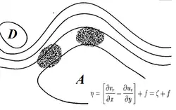 De la même façon, un déplacement latéral d'une particule d'air change son tourbillon absolu η. Ce dernier est constitué de , le paramètre de Coriolis, et de , le tourbillon géostrophique[6] :