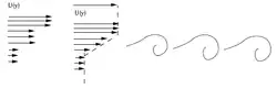 À cause de la viscosité, la vitesse de déplacement à la frontière aura tendance à s'égaliser et donc on aura une gradation dans chacun des fluides de la vitesse entre celle originale dans le fluide et celle à la frontière (image du haut à droite). On introduit ainsi un cisaillement du déplacement et donc une rotation, un tourbillon, dans chacun des fluides près de la surface de contact. Les fluides doivent être stables thermiquement pour que la rotation se propage en aval de son point de création, autrement le cisaillement se propage sur une large couche dans la verticale et l'onde générée est très faible.