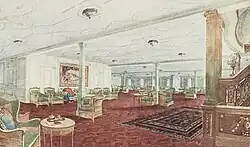De style Louis XV, le salon de première classe occupe le centre du pont A, entre les deux escaliers de première classe. Il est notamment pourvu d'une cheminée en marbre et d'une bibliothèque et est décoré de répliques d'éléments du château de Versailles[24]. La cheminée est surmontée d'une statue baptisée L'Artémis de Versailles[7]. La pièce affiche des teintes à dominantes de vert et d'or. Le centre de la salle est surmonté d'une coupole. Reliée à un ventilateur du pont, elle est conçue pour aérer la pièce, et dispose en son centre d'un grand lustre ovale. Une dizaine de cloisons créent des recoins donnant aux passagers qui s'y trouvent un peu d'intimité[a 36]. On y accède par deux corridors ou par deux vestiaires donnant sur le pont promenade[a 37]. Comme la plupart des cheminées du navire, celle du salon fonctionne à l'électricité par mesure de sécurité[a 33].