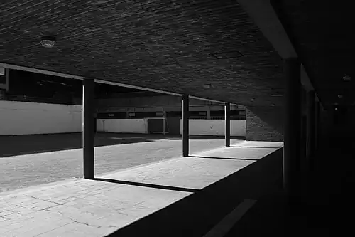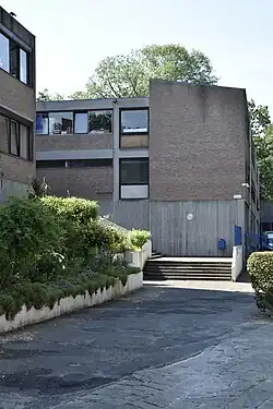 Pour ce bâtiment, au niveau du sous-sol, seul le noyau de circulation et de techniques au centre du plan est composé de blocs de béton. Pour le reste, tout est fait à l’aide de béton armé coulé sur place, employant la technique des coffrages voligés, ainsi que de coffrages lisses pour les éléments structurels apparents telles que les colonnes et les poutres. L’étanchéité des murs contre terre est réalisée de la même manière que le semi-internat.