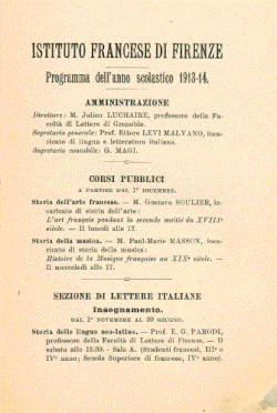 Il s’agit donc d’une tentative pionnière de politique diplomatique à travers la culture, la langue, l’échange et la confrontation intellectuelle, avec aux manettes un homme comme Luchaire – ce n’est pas un hasard si pendant l’entre-deux-guerres il joue un rôle important dans la Commission internationale de coopération intellectuelle dans la Société des Nations puis dans des organismes annonçant la future UNESCO, comme l’Institut International de Coopération Intellectuelle[12]. Ainsi, des représentants de la culture et de la politique à Florence (par exemple Paul Sabatier, Pio Rajna, Guido Mazzoni, Pasquale Villari, Robert Davidsohn) participent à l’inauguration, et des proches du directeur sont très actifs à l’institut pendant les premières années : Giovanni Papini, Giuseppe Prezzolini et surtout Gaetano Salvemini, qui a épousé en 1916 celle qui sera la première ex-femme de Julien Luchaire, Fernande Dauriac[13] (1877-1954), la mère de Jean Luchaire et de Marguerite Luchaire[14],[15],[16],[17].
