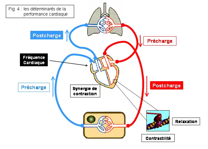 - la précharge = distension des cellules cardiomyocytes en fin de diastole, avant la contraction. Elle est conditionnée par le volume et la pression du compartiment veineux, en amont du cœur, ainsi que par le volume ventriculaire résiduel (quantité de sang restant dans le ventricule en fin de systole). Lorsque la précharge augmente, le VES augmente,