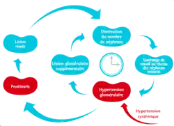 - Hélas, cette hyperfiltration est associée à une hypertension glomérulaire chronique, créant des lésions glomérulaires supplémentaires sur les "super-néphrons" qui conduisent sur le long terme à une perte progressive des derniers néphrons fonctionnels.