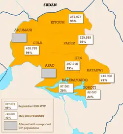vit le début d'une importante tentative du gouvernement pour détruire la LRA, connue ultérieurement sous le nom d'« opération Nord ». La totalité du Nord du pays fut bouclée et toutes les organisations humanitaires furent forcées d'évacuer en préparations des opérations contre la rébellion. L'opération Nord combina des efforts de destruction des unités combattantes tout en coupant le soutien de la population locale par une poigne de fer, incluant des arrestations arbitraires, des tortures et des exécutions sommaires[7]. Bien que cette opération ait été partiellement motivée par les nuisances de la LRA, l'approbation d'un prêt pour la reconstruction des infrastructures dans le Nord par la Banque mondiale en joua également un rôle car sa mise en œuvre nécessitait un contexte sécurisé[8].