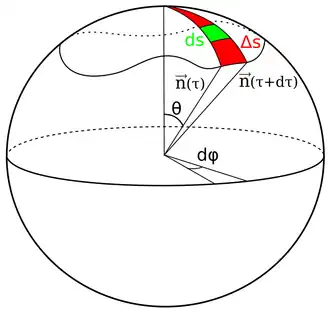 Angle solide balayé par le vecteur sur la sphère unité. On a en vert l'aire que l'on peut intégrer pour obtenir la surface représentée en rouge . Afin d'intégrer pour obtenir l'angle solide total on écrira comme .