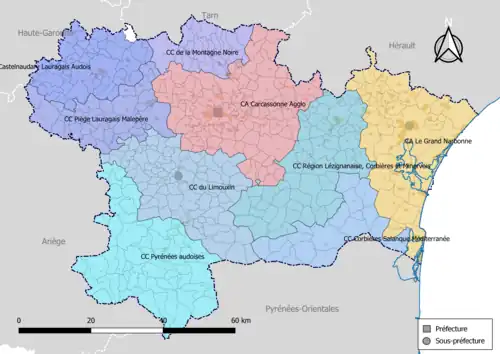 Le nombre d'EPCI passe ainsi de 29 en 2012 à 17 au (15 communautés de communes et 2 communautés d’agglomération autour de Narbonne et Carcassonne)[13] puis au (9 communautés de communes et 2 communautés d’agglomération autour de Narbonne et Carcassonne)[13]. L'ensemble des 438 communes est rattaché à un Établissement public de coopération intercommunale à fiscalité propre et il y a une forte diminution du nombre de structures. Il en reste toutefois deux dont la population est inférieure à 5 000 habitants.