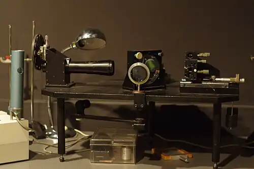 L'interféromètre de Michelson a été utilisé pour la première fois dans l'Expérience de Michelson-Morley, qui a permis de montrer, d'une part que la vitesse de la lumière dans le vide ne dépend pas du référentiel d'observation, d'autre part que l'éther n'existe pas, ce qui a conduit à la théorie de la relativité restreinte et à la révolution de la physique au début du XXe siècle[5].