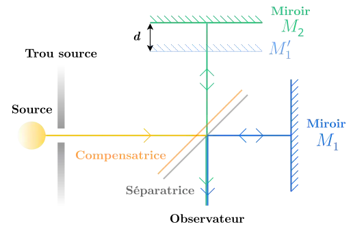 Sur le schéma ci-contre, qui modélise un Michelson utilisé en lame d'air, la source de lumière envoie un rayon (d'intensité ) vers la lame séparatrice. Ce rayon est divisé en deux rayons (bleu et vert) d'intensité . représente l'image du miroir par la séparatrice, donc symétrique par rapport à celle-ci. La différence de longueur des bras de l'interféromètre induit une différence de marche entre les deux rayons égale à .