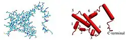 Le monomère d'IFNγ consiste en un cœur de six hélices alpha ainsi qu'une séquence étendue non pliée dans la région C-terminale (voir figure ci-contre à gauche)[10]. Les hélices α au cœur de la structure sont numérotées de 1 à 6.