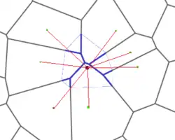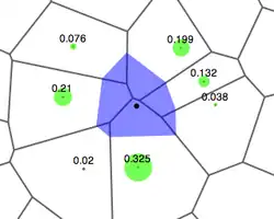 où l(xi) désigne la mesure de l'interface entre les cellules liées à x et xi dans le nouveau diagramme de Voronoi (longueur d'arête en 2D, surface en 3D) et d(xi), la distance entre x et (xi).