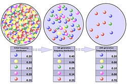 Le principe de Hardy-Weinberg stipule que, sous certaines conditions idéales, notamment l'absence de pressions sélectives, une grande population ne connaîtra aucun changement dans ses fréquence alléliques au fil des générations[34]. Une population qui satisfait à ces conditions est dite en « équilibre de Hardy-Weinberg ». En particulier, Hardy et Weinberg ont montré que les allèles dominants et récessifs n'avaient pas automatiquement tendance à devenir plus ou moins fréquents respectivement, comme on le pensait auparavant.
