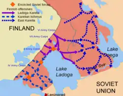 L'invasion finlandaise de la Carélie orientale est une campagne militaire menée de juillet à décembre 1941 pendant la guerre de Continuation, opposant les troupes finlandaises et allemandes aux troupes soviétiques. Les troupes finlandaises occupent la Carélie orientale et la conservent jusqu'en 1944. Pendant plus d'un mois après le déclenchement de la guerre de Continuation, l'armée de Carélie est renforcé et se prépare à reprendre son offensive précédente en attendant la reconquête de l'isthme de Carélie. Les Soviétiques ont préparé des fortifications et amené des troupes sur le front. Lorsque les efforts d'encerclements sur la rive ouest du lac Ladoga seront résolus, la 7e division finlandaise sera transférée à la jonction des VIe et VIIe corps.