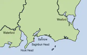 Une carte montrant les emplacements de Bannow (en), Baginbun, Wexford et Waterford