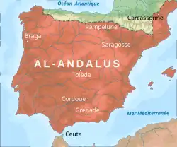 En 711, les armées musulmanes dirigées par Tariq ibn Ziyad traversent la Méditerranée et débarquent à Gibraltar, au sud de la péninsule ibérique. Après avoir battu les Wisigoths à la bataille du Guadalete, ils réduisent en cinq ans le royaume wisigoth à la seule province de Septimanie[1].