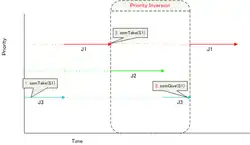 Il en résulte une inversion des priorités, la tâche B continuant de s'exécuter jusqu'à son terme, puis C, et enfin A : la tâche de plus haute priorité s'exécute en dernier ! Ce deuxième exemple est plus difficile a anticiper et à appréhender, car la tâche B bloque la tâche A alors qu'elles ne partagent aucune ressource.