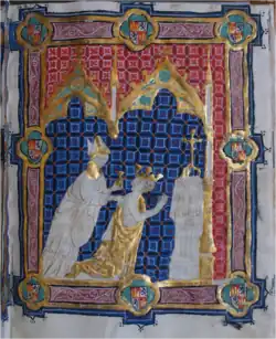 Dans le royaume d'Aragon, la pratique du couronnement apparait en 1204 avec le couronnement de Pierre II à Rome par Innocent III sous la forme d'un couronnement « impérial »[15]. Le pape fulmine l'année suivante une bulle permettant au roi d'Aragon d'être couronné à Saragosse par l'archevêque de Tarragone, mais sous la condition de l'accord du Saint-Siège[16]. Si Jacques Ier cherche à réduire l'emprise pontificale et déclare avoir obtenu son royaume par la conquête sur les musulmans, son fils Pierre III d'Aragon décida tout de même d'avoir un couronnement, mais sans demander au préalable l'accord de la papauté[15].