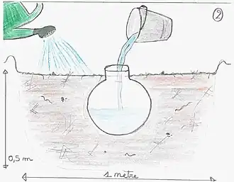 Cette technique repose sur l'utilisation d'un pot d'argile cuit à "basse température" (afin de garder la bonne porosité) que l'on enterre jusqu'au col et remplit d'eau pour irriguer les plantes placées alentour. Les parois poreuses diffusent lentement l'eau qui sera absorbée par les racines des plantes.