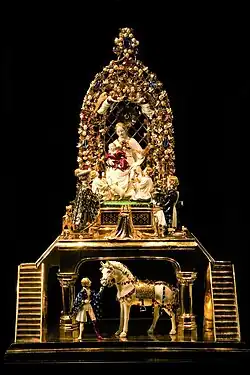 Comme de nombreuses reines de la maison de Valois, Isabeau de Bavière est une collectionneuse d'art appréciée et est responsable de nombreuses commandes auprès d'orfèvres parisiens de somptueuses pièces en or recouvertes d'émail sur ronde-bosse. Aux étrennes du 1er janvier 1405, elle offre à son époux le Goldenes Rössl (connu aussi sous le nom de La Vierge à l'Enfant en un jardin en manière de treilles), une pièce d'orfèvrerie parisienne aujourd'hui conservée dans la collégiale Saint-Philippe-et-Saint-Jacques d'Altötting[N 9],[105]. La coutume romaine des étrennes a été ravivée par Charles VI pour établir un rang et des alliances pendant cette période de factionnalisme et de guerre. Le Goldenes Rössl est pourtant la seule étrenne documentée de l'époque qui ait subsisté. Pesant 26 livres, la pièce d'or, incrustée de rubis, de saphirs et de perles[106], représente la Vierge en majesté portant sur ses genoux l'Enfant Jésus, devant laquelle sont agenouillés saint Jean-Baptiste, saint Jean l'Évangéliste et Charles VI en adoration. Isabeau de Bavière poursuit également la coutume des étrennes avec Jean Ier de Berry à l'occasion de ce même Nouvel An : l'une des pièces qui subsistent est une statuette de sainte Catherine d'Alexandrie en ronde-bosse.