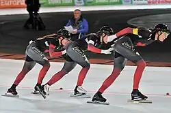 - ↑ (en-CA) « Canada sets Olympic record en route to speed skating gold medal in women's team pursuit », CBC Canada, (lire en ligne)