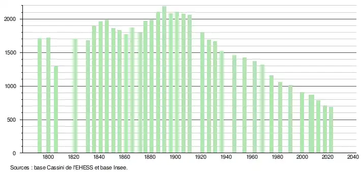 L'évolution du nombre d'habitants est connue à travers les recensements de la population effectués dans la commune depuis 1793. Pour les communes de moins de 10 000 habitants, une enquête de recensement portant sur toute la population est réalisée tous les cinq ans, les populations de référence des années intermédiaires étant quant à elles estimées par interpolation ou extrapolation[17]. Pour la commune, le premier recensement exhaustif entrant dans le cadre du nouveau dispositif a été réalisé en 2007[18].