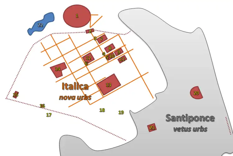 Italica est une ancienne ville romaine de la province de Bétique, située sur la municipalité actuelle de Santiponce (province de Séville, Andalousie, Espagne). Fondée en 206 av. J.-C. par Scipion l'Africain, elle atteint son apogée sous les règnes de Trajan et Hadrien, dont les familles sont installées dans la cité depuis un siècle ou deux.
