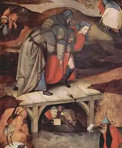 Lui aussi de la génération suivante, le Maître du volet double-face du musée des beaux-arts de Valenciennes est nommé d'après un panneau qui montre d'un côté saint Jacques devant le magicien Hermogène[30], de l'autre Les Tentations de saint Antoine. Actif sans doute à Anvers au milieu du XVIesiècle, il est également l'auteur d'œuvres autrefois attribuées à la jeunesse de Bosch, comme le Ecce Homo du musée d'art d'Indianapolis[31], caractérisé par un fond d'or. Sa production se définit par une lecture un peu sèche des modèles «boschiens», par une palette vive et par une conception singulière des personnages aux yeux ronds. S'y rattachent les cartons de toute une série de tapisseries réalisées d'après des œuvres ou, du moins, des inventions de Bosch, comme Le Jardin des délices, Le Chariot de foin ou encore La Charité de saint Martin, dans laquelle les mendiants peuvent être aisément comparés aux personnages monstrueux du tableau de Philadelphie.