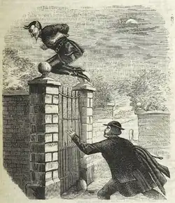 Illustration romancée représentant Jack Talons-à-Ressort sautant un portail.