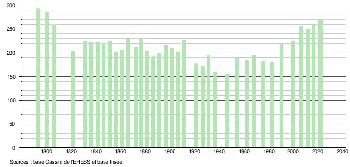 L'évolution du nombre d'habitants est connue à travers les recensements de la population effectués dans la commune depuis 1793. Pour les communes de moins de 10 000 habitants, une enquête de recensement portant sur toute la population est réalisée tous les cinq ans, les populations de référence des années intermédiaires étant quant à elles estimées par interpolation ou extrapolation[22]. Pour la commune, le premier recensement exhaustif entrant dans le cadre du nouveau dispositif a été réalisé en 2006[23].