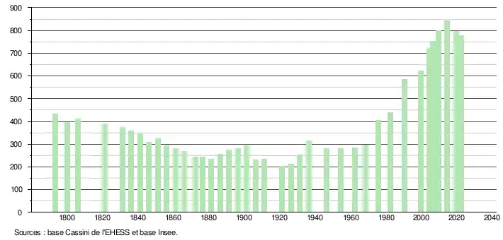 L'évolution du nombre d'habitants est connue à travers les recensements de la population effectués dans la commune depuis 1793. Pour les communes de moins de 10 000 habitants, une enquête de recensement portant sur toute la population est réalisée tous les cinq ans, les populations de référence des années intermédiaires étant quant à elles estimées par interpolation ou extrapolation[27]. Pour la commune, le premier recensement exhaustif entrant dans le cadre du nouveau dispositif a été réalisé en 2004[28].