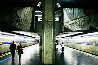 - Construção de São Paulo (panneau), Maria Bonomi, béton conventionnel moulé sous forme gravée (1998), béton armé (2 panneaux de béton, mesurant 3,00 m X 6,00 m X 2,70 m (total 52,20 m²)), installé sur le quai d'arrive[7].