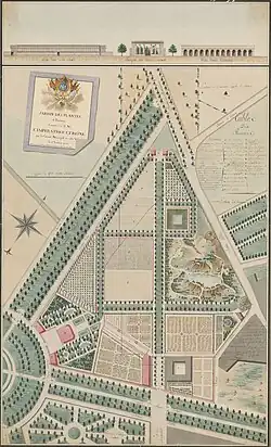 En juillet 1795, alors que la Convention thermidorienne a décidé de rendre les chapelles et les églises au culte catholique, le directoire du département décide d'affecter l'église des Carmes (actuelle église Saint-Exupère, no 33 allées Jules-Guesde) aux habitants du faubourg Saint-Michel, mais conserve au jardin botanique la sacristie et les chapelles du côté ouest[14]. En décembre 1795, le directoire du département établit un plan d'agrandissement du jardin botanique, dont les limites seraient données, à l'ouest par le chemin de Montaudran (actuelle rue Alfred-Duméril), au nord par l'Esplanade (actuelles allées Jules-Guesde), et à l'est par la Grande Allée (actuelles allées Serge-Ravanel et Frédéric-Mistral)[15]. En mai 1804, la commune obtient la concession de tout l'ancien couvent des Carmes déchaussés et de son jardin[16]. Elle décide aussitôt la construction d'une nouvelle entrée, face à l'Esplanade (actuelle porte Virebent, allées Jules-Guesde)[17].