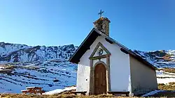 Peu avant le hameau de Notre Dame, la chapelle Rose, dite encore chapelle de la Varde ou encore chapelle Saint-Roch, posée sur son éperon rocheux, sur fond d'Aiguilles d'Arves enneigées. C'est le plus vieux édifice construit de Jarrier.